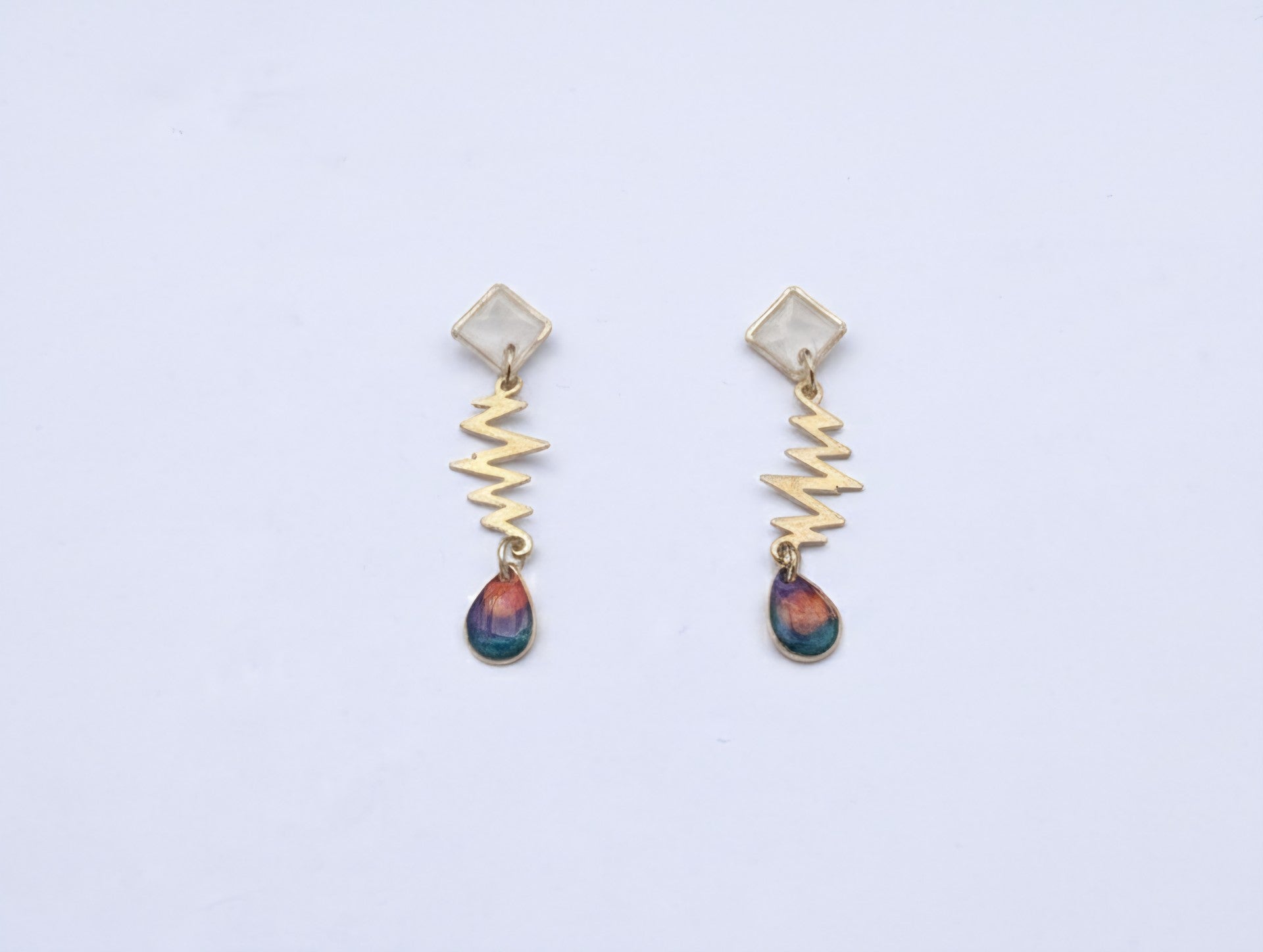 Twee goudkleurige vierkante Oorstekers, gevuld met epoxy: wit en goudkleurige Straal ( 20mm) met Druppel (10mm), gevuld met epoxy: oranje, paars en groen
