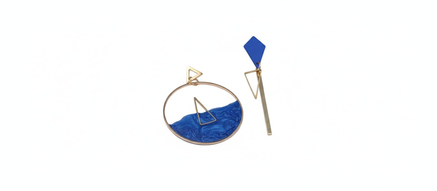 Twee oorstekers: open Driehoek (7mm) met goudkleurige Hoop (40mm) met gelijkbenige Driehoek, gevuld met epoxy: blauw en blauwe Ruit (10*20mm) met Staafje (40mm) en open gelijkbenige Driehoek