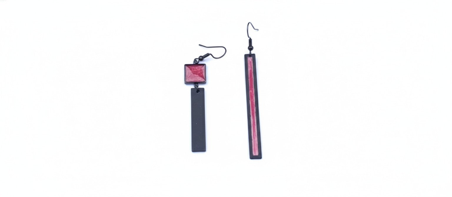 Twee zwarte Oorhaakjes, Vierkant (10mm) gevuld met epoxy: rood en roze en brede Staaf (30mm) en open zwarte Staaf (60mm) gevuld met epoxy: rood en roze